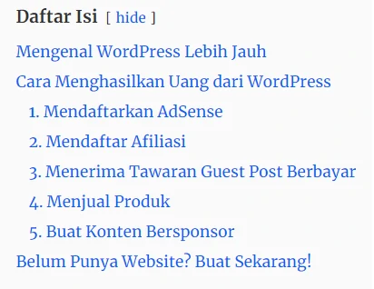 Nah, melihat betapa berpengaruhnya daftar isi terhadap pengalaman pengguna, Anda sangat disarankan untuk membuat daftar isi pada setiap konten.