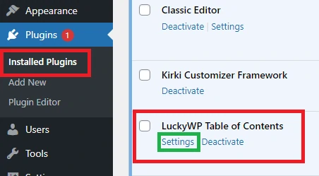 • Kembali ke menu Installed Plugin. Cari LuckyWP Table of Contents dan klik Settings untuk mengubah pengaturan daftar isi.