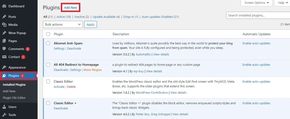 • Akses menu dasbor WordPress Anda, lalu pilih Plugins, kemudian klik Add New