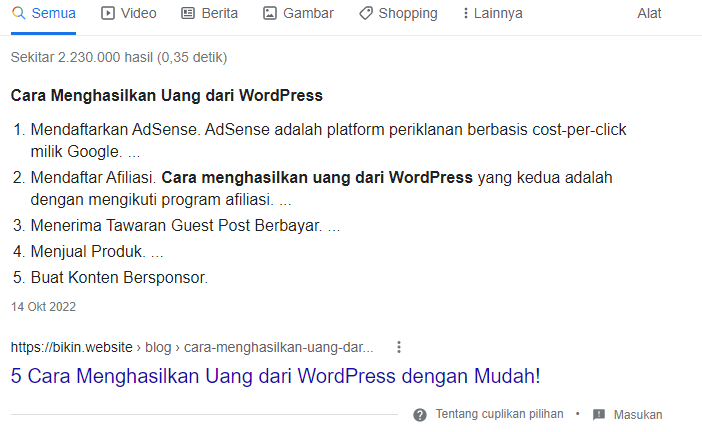 Cuplikan yang ditampilkan mesin pencari menggunakan daftar isi
